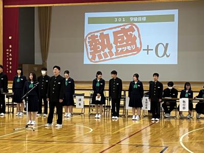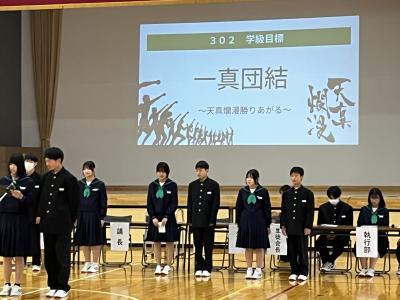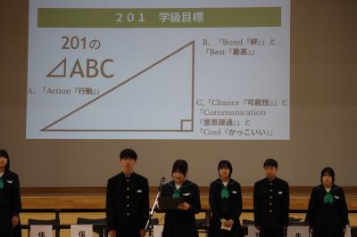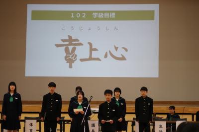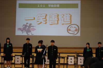 生徒総会で披露した、学級目標です。(発表順に…301,302,201,101.102)