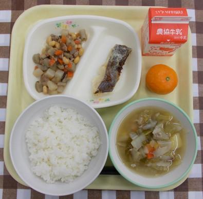 白ごはん、ホキの塩こうじ焼き、五目豆、さつま汁、