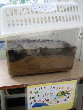 1・2年生が飼っているカメの「げんき」は、子どもたちより一足お先に冬休みに入っています。
