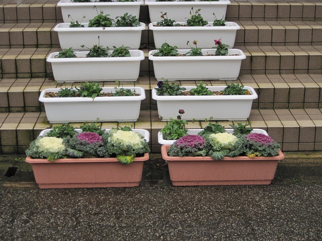 玄関前に六株の葉ボタンがやってきました。パンジーと同じで、寒さに強く上に雪が積もれば積もるほど根が張って丈夫なものになるそうです。