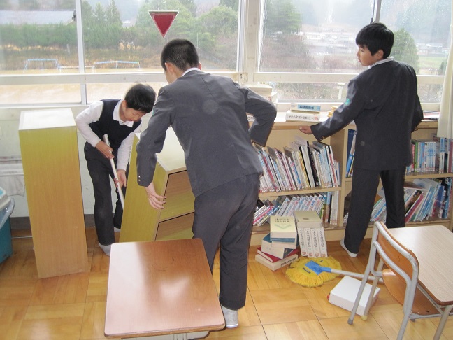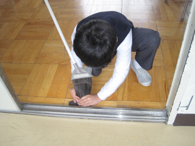 掃除の時間に2年生が少しでもゴミを集めようとして、教室中の隙間を見つけてはゴミを掃き出しています。