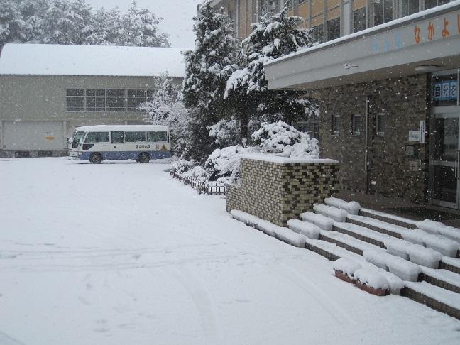 13日午前11時、校舎前の様子です。今も雪が「しんしん」と降っています。