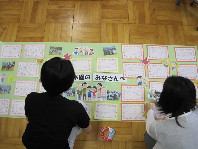 17日にあての木園で敬老会があります。そのプレゼントづくりに子どもが書いたメッセージを職員が貼り付けている様子です。ほのぼのとしたメッセージを読みながらの作業はとても楽しそうです。