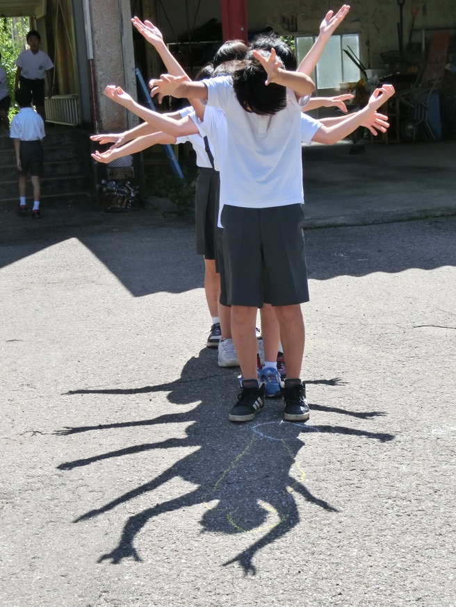 昼休みに5・6年生が仲良く大きな影絵をつくって遊んでいました。