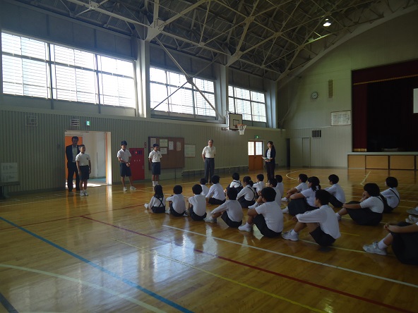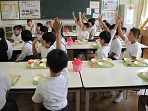 給食後に生徒指導の先生から、「9月の生活目標(身のまわりを清潔にしよう)を守れましたか?」との質問で手を上げた児童の様子です。ほとんどの児童がしっかり守れたようです。