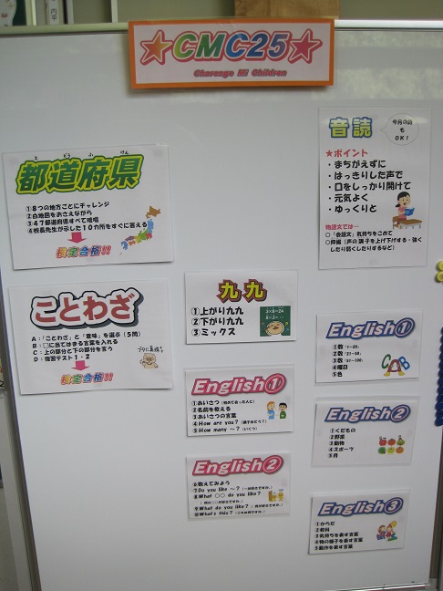 校長室の前に「CMC25」と書かれたホワイトボードが置いてあります。名付けてCharenge Mii Children!!ことわざや九九、英語、都道府県など多くの分野の中から、校長先生に挑戦できます。挑戦者どんどん募集中