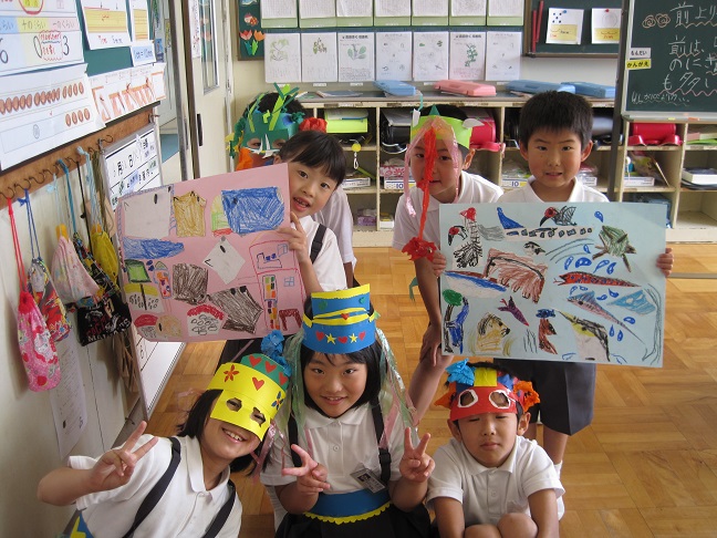 図工の時間に作った作品を身につけて見せてくれました。みんなかっこよく変身できましたね