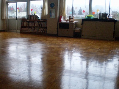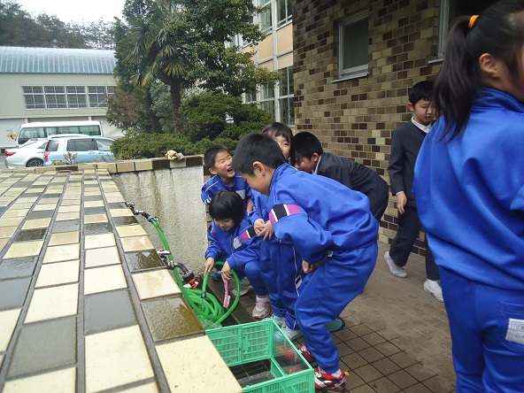 1・2年生は去年から教室で飼っているカメの入れ物の掃除をしました。ついでにカメの甲羅もていねいにみがいていました。