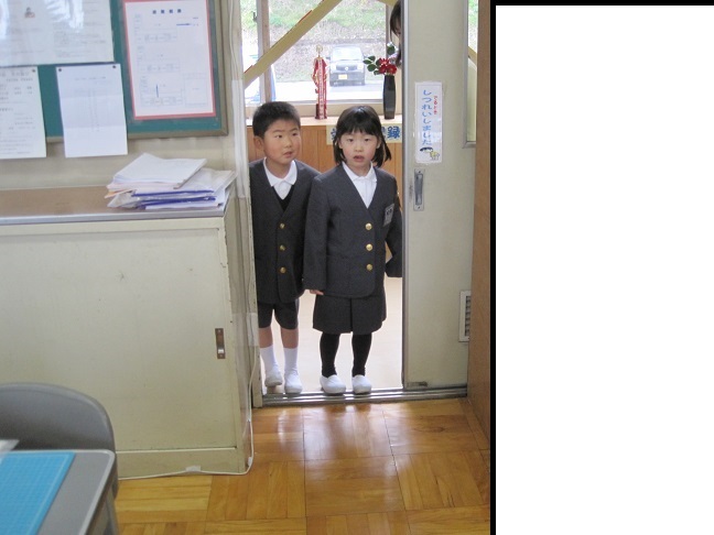 1年生が職員室の入り方を勉強しました。「しつれいします」と大きな声で戸を開けていました。