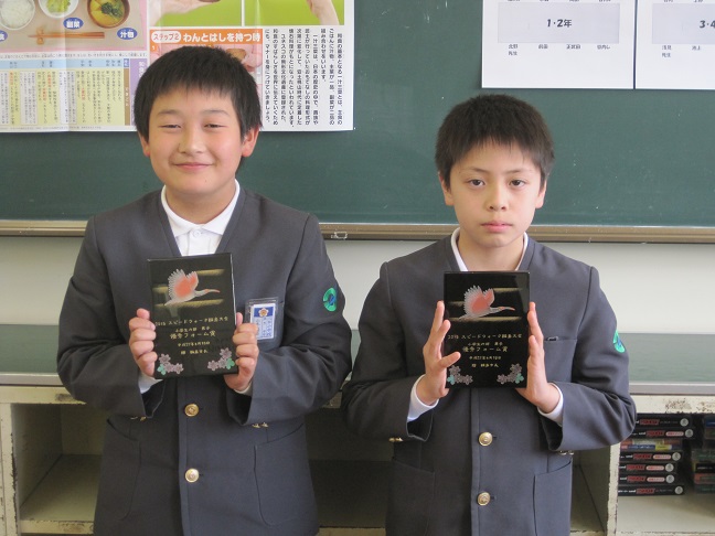 18日に行われたスピードウォークで市内6年生から10名の優秀フォーム賞が与えられました。その中で三井小学校から松本君と山本君の2名選ばれました。タイムは松本君がトップでゴールすることができました。今日の給食時間に2名の表彰式を行い、その後で2人が表彰式で頂いた盾を全校の前で披露しました。