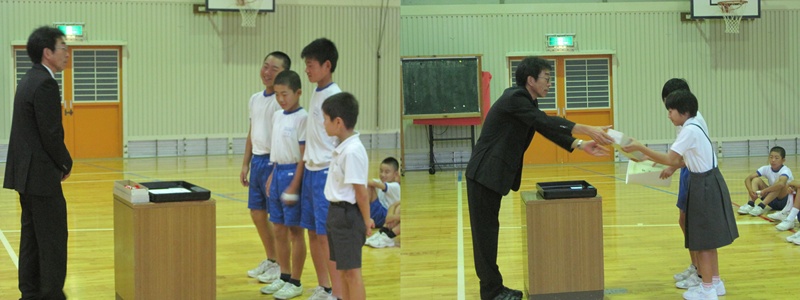 また始業式後に,輪島市水泳記録会とバスケットの表彰式も行われました。