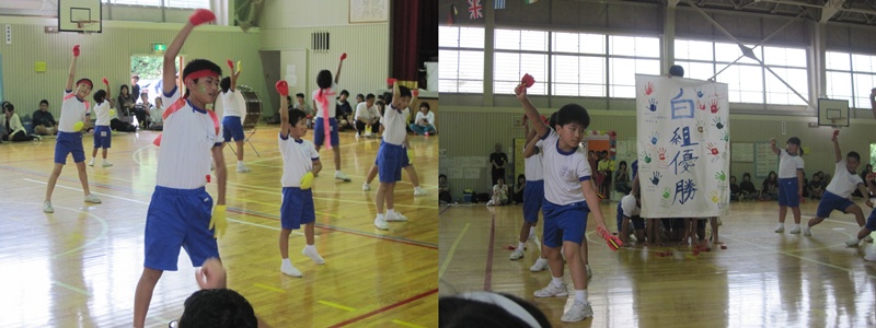 生憎の雨で,体育館での開催となりましたが,子どもたちは,赤組,白組に分かれて,元気いっぱい,力いっぱい競技に取り組みました!