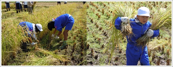 子どもたちは,それぞれ鎌を手に,上手に稲を刈っていましたよ!