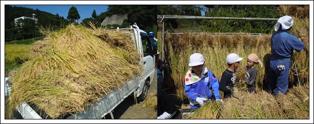 今日の3,4限目はその第二回目で,地域の方々や,保護者の方,航空学園のお兄さん,お姉さんたちに,お手伝いいただいて,『稲刈り体験』と,『はざ干し体験』を行いました。