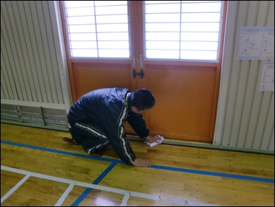 卒業式に向けて教室や廊下、そして体育館のワックスがけを行いました。特に体育館には地域の方4名も参加して頂き、水拭きやワックスがけを手伝って頂きました。おかげさまでとても綺麗になりました。有り難うございましした。