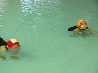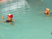 1・2年生は小プールで、「わに」や「かに」などの生き物のように歩いたり、