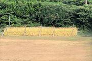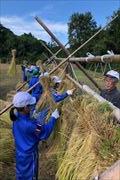 4~6年生は、学校にもどり、水分補給をして一休みした後、学校の運動場に準備したはざに稲をかけました。