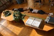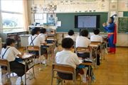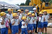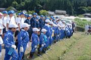 40年以上使っているという脱穀の機械ハーベスターを使って行いました。4~6年生がハーベスターまでの稲運びの手伝いをしました。1~3年生は、脱穀の様子を見学したあと、教室でお米を入れる袋のシール張りをしました。