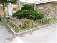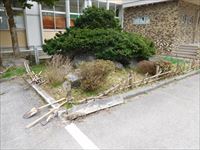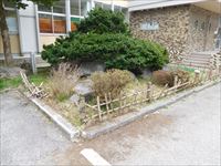 イチイの周辺の修繕が必要となりました。(コンクリート塊が浮き上がり、竹垣がズタズタ)
