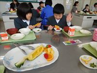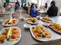 給食の後、ずらっと並んだフルーツを、ちょっと贅沢に頂きました。