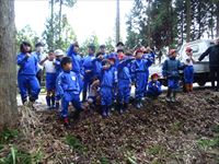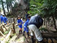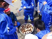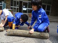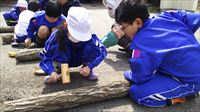 木槌で菌を植えます。各班で協力しながら、上級生が下級生に教えたりします。