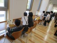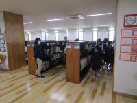 輪島中学校の図書館で、たくさんの本に出合いました。本が分類番号ごとに並べられているのを確認し、興味がある本を手に取っていました。