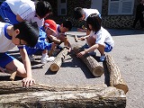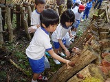 写真1枚目 玄関前で22本のホダ木に種駒を木槌で打ち込みます。児童数22人なので22本なのですが、3班に分かれて、みんなで協力して打ち込みました。椎茸は115号という品種です。