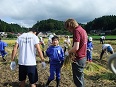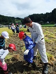 5・6限に稲刈りをしました。今年も地域の方18名と航空高校13名が手伝いに来てくれて、学校と併せて総勢60人で行いました。カマで稲を刈るのは順調に進みましたが、稲を集めてしばる作業にはみんな苦労して慎重に行っていました。小さな田んぼですが、一人ひとり十分に汗をかいた作業となりました。その後、運動場に行って地域の方4人と稲をはざに掛けました。