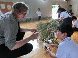 今日の飾りつけにALTのスティーブン先生も参加しました。日本の伝統の七夕に興味があるようで、子どもたちに「What's this?]」と英語で質問していました。子どもたちも「It's milky way.」と折り紙の説明をしていました。