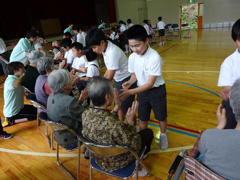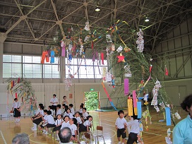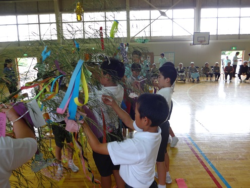 1時30分からあての木園から約30名の方が来校され、児童会主催の七夕集会を開きました。最初に今月の歌と七夕を歌いました。その後、短冊に書かれた長いごとを発表し、竹の葉に付けました。次に各委員会が考えた七夕の話とゲームを行いました。ゲームは、あての木園の方とジャンケンをして、その勝ち負けで肩たたきや握手をする内容で、みんなに喜ばれ大変に盛り上がりました。