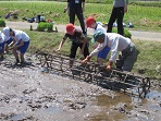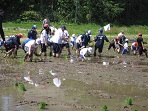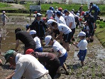 今日は朝から晴れ渡り、絶好の田植え日和でした。1時30分から全校児童と地域の人や航空高校の生徒、あわせて70人で田植えを行いました。小学生は毎年の行事で慣れていますが、高校生は留学生が多く、その上初めての田植えで泥にまみれて喜んで作業をしていました。そんな姿を見て小学生も喜んで高校生と話しながら苗を植えていきました。地域の人は終始笑顔で、作業をしながら子どもたちの様子をみて声を出して笑っている方もおいでました。そんな状況の中でも、さすがに大人数、40分できれいに田植えを終えることができました。