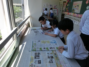 今まで玄関にあった子ども新聞のコーナーを二階ランチルームの前に移しました。広々としたスペースでゆっくり座って読むことができ、今、人気の場所になっています。