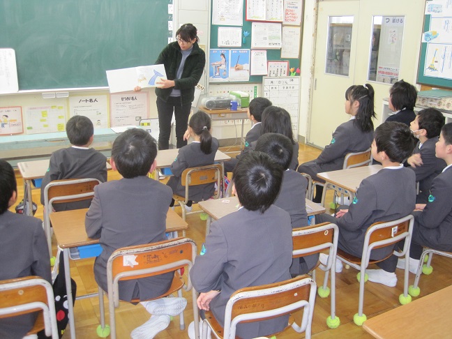 今日は月一回の読み聞かせの日でした。ボランティアの山下さんに「雪だるまのボタン」と「ほねの話」の紙芝居をして頂きました。二つの話とも子どもたちは興味を持って一生懸命に聞いていました。後の感想でも2人が自主的に手を上げて感想を話していました。
