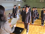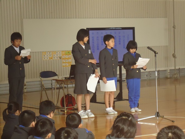 4時間目に校内テスト表彰と2学期の終業式を行いました。表彰では6年の岩﨑君が代表して満点賞の賞状を受け取りました。終業式では校長先生の話の後、各学年代表6人が2学期がんばったことを発表しました。学年が上がるごとに年相応の内容で、具体的にわかりやすく話すことができました。
