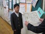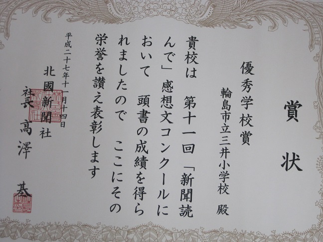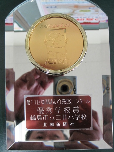 14日の土曜日、北国新聞本社で「新聞を読んで」感想文コンクールの表彰式がありました。三井小学校は「優秀学校賞」として、賞状と鏡の盾、そして図書一式を頂きました。また、個人表彰として4年生の坂出舶君が「朝市のおばちゃん達の語学研修」の作文が佳作賞を頂きました。その表彰伝達式を給食後にしました。式が終わった後、子どもたちは楯に自分の顔を写して喜んでいました。