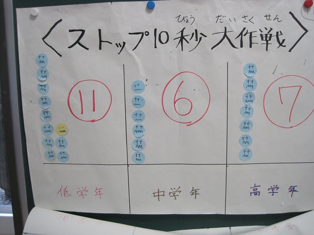 ストップ10秒大作戦は、廊下を走った子がいたら先生がストップの声かけをします。言われた子はその場で10秒間待つ決まりです。写真のシールと数字は、声がかかった人数で11月の結果です。12月は、今のところ少なめに推移しています。