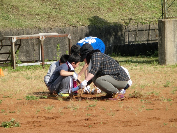 5月24日の「あての森総合運動会」に向けて学校では子どもたちは先週の水曜日から練習に入っています。今日はその運動会に向けて4・5・6年の児童と全保護者とボランティアの方で運動場の草むしりをしました。児童数からみると、とても広い運動場で大変な作業となりましたが、朝からさわやかな青空の下で、作業を通して子どもたち同士、又は地域の人とのふれあう機会ともなりました。