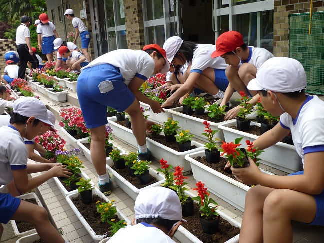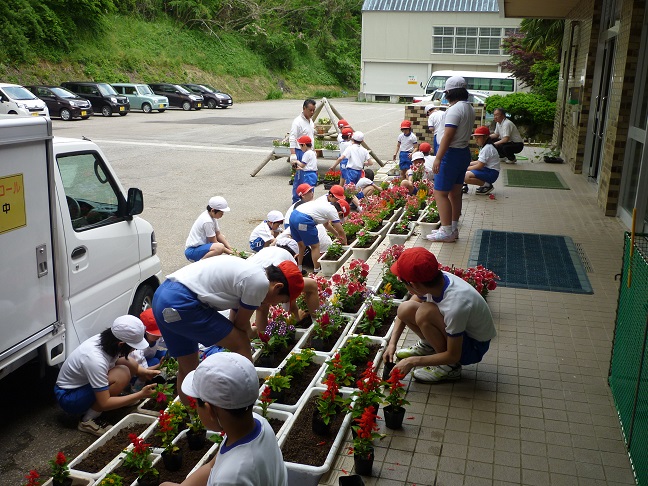 今日4限目に全校でプランタの花植えをしました。花苗としてマリーゴールド、サルビア、メランポジューム、バーベナ、ペチュニア、ケイトウ、日々草を植えました。いろいろな花があって女子の中に「きれい」とか「かわいい」という声も聞かれました。一度見に来て下さい。