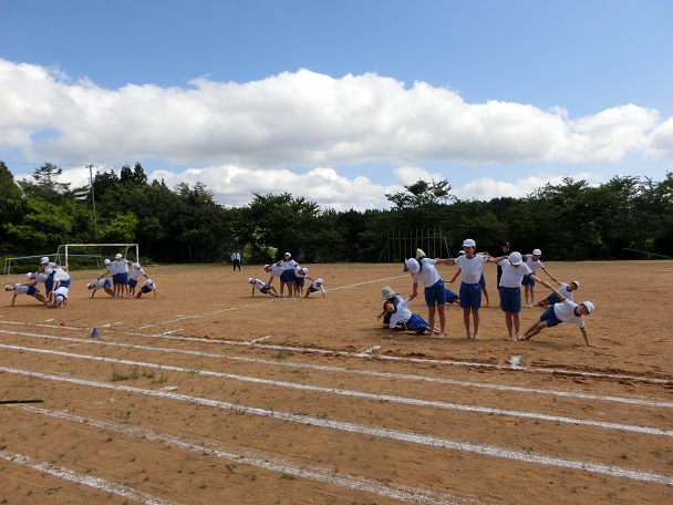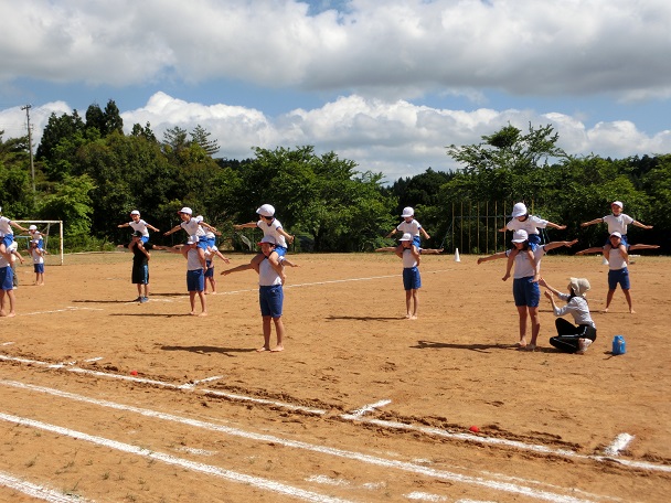 24日の運動会が近づいてきました。たくさんの種目練習を行ってきましたが、今までグランドの調子が思わしくなく、外で練習したことがありませんでした。今日、初めて外で組み体操の練習をしました。体育館とは違って広くて自分の立つ位置や横のグループとの距離が思うようにとれず苦労していました。さわやかな空のもとで、子どもたちは気持ちよくいろいろな動きに挑戦していました。