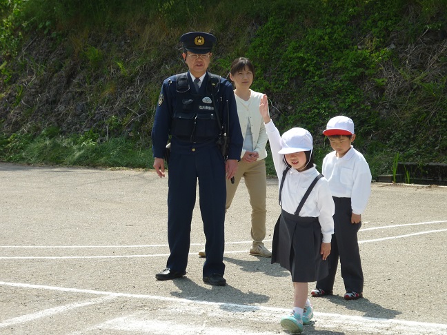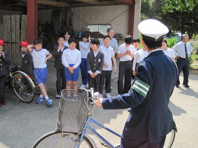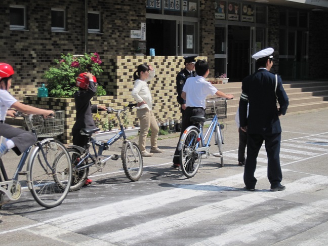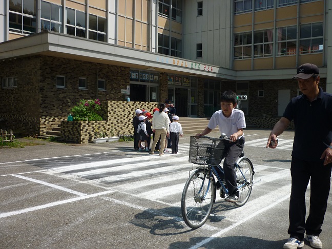 7日の5限目に学校の駐車場を使って、警察の方の協力で低学年は道路の歩き方と横断歩道の渡り方、中高学年は自転車乗りの練習をしました。