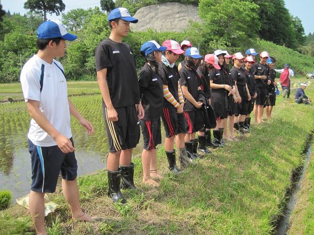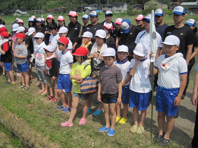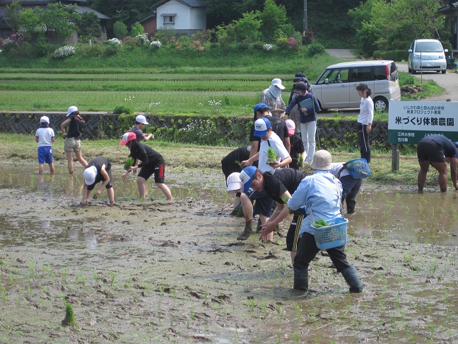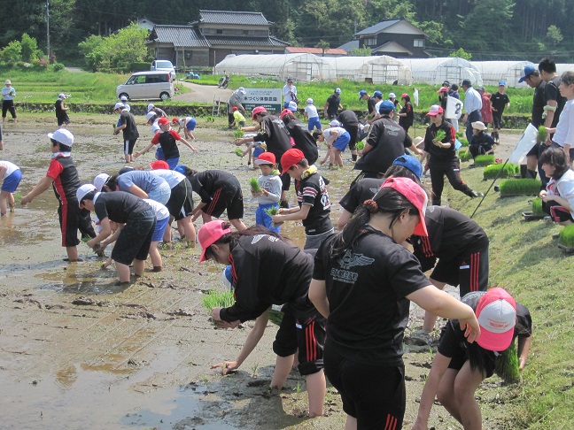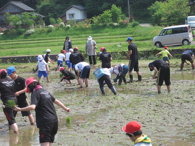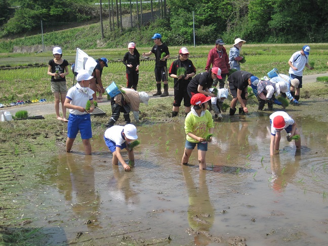 5時間目に田植えをしました。今回も地域の方15名、航空高校27名、小学生25名、職員8名 の75名でおこないました。おかげで40分できれいに田植えを終えることができました。小学生は慣れた手つきで低学年でも手際よく植えていくことができました。高校生は今回ほとんどが留学生で泥の感触を楽しみながら稲を植えていました。そんな姿を見て、地域の方も笑いながら児童や生徒に話しかけながら作業を行っていました。天気にも恵まれ三井地区の交流会ともいえる行事を無事終える事ができました。