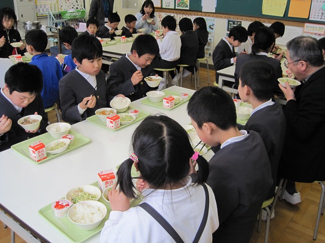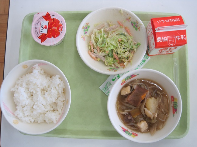 今日の給食は、ごはん、すき焼き風に、ごまサラダ、おいわいぜりーでした。みんな久しぶりの給食で楽しそうに味わって食べていました。1年生は量の多さに驚きながらも、喜んで食べていました。
