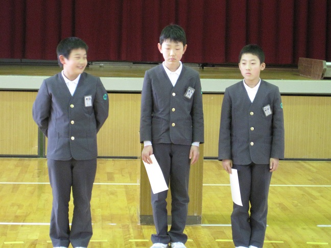 4時間目に児童集会があり、3つの児童委員長の任命式がありました。その後、各委員長から委員長としての心構えを聞きました。3人ともしっかりした思いを話すことができ、低学年の手本となりました。