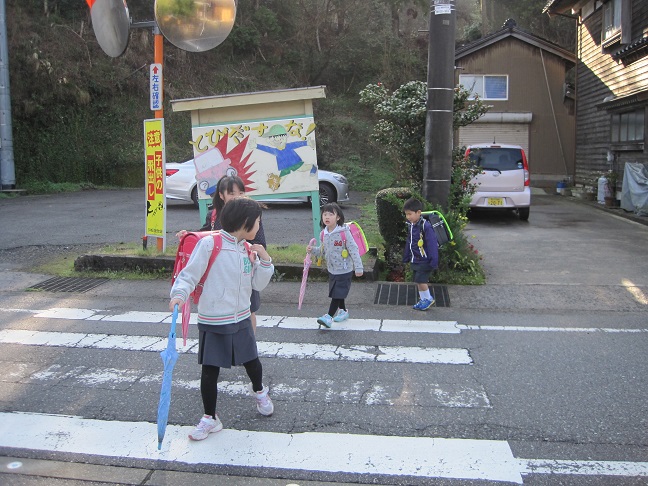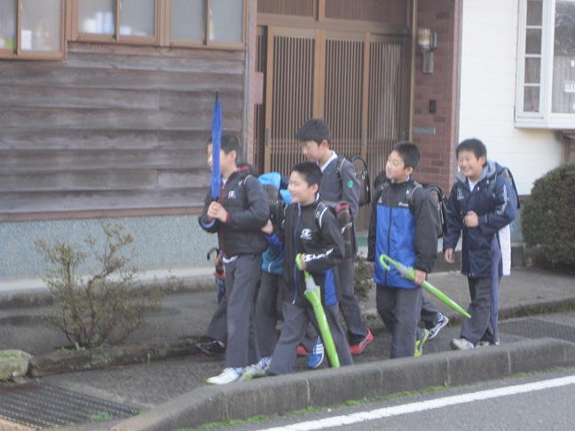 2年生が1年生に横断歩道の渡り方を説明しながら歩いていました。さすが2年生ですね。高学年の男子児童はかたまって今日の予定を話しながらの登校です。みんな笑顔で楽しそうに歩いていました。