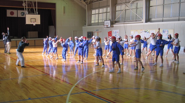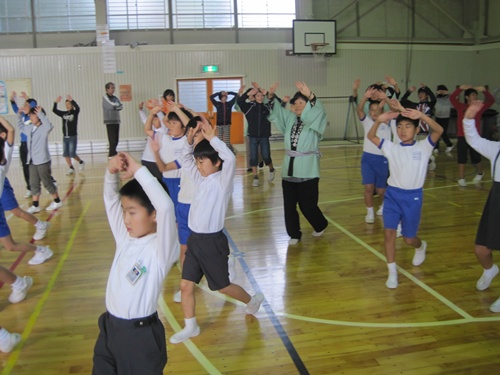5限の全校体育の時間に,地域の人に来ていただいて「田切唄」を指導していただきました。