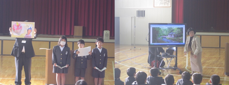 2年生の猿鬼伝説の紙芝居の発表や,猿鬼を長年調べていらっしゃる仲谷先生をお招きしてのお話もありました。