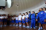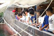 最終日の午前中はバスで移動して、海洋センターでの活動と九十九湾遊覧船に乗っての体験です。大きな鯛や烏賊、蛸、天然の鯵へ餌付け体験しました。