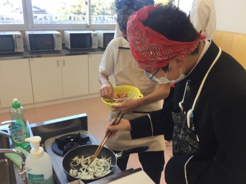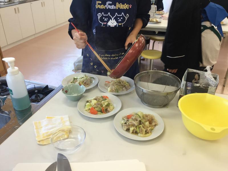 1年生の家庭科で調理実習を行いました。野菜と肉の両方を使った料理、回鍋肉を作りました。班の中で役割を分担しながら、とても美味しそうに作ることができました。