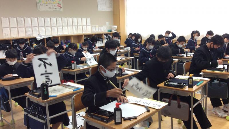 1月5日、3学期が始まりました。いつもより短い冬休みでしたが、多くの生徒達は少し眠そうな中にも元気そうに登校しました。競書会では、1年生「不言実行」、2年生「新しい目標」、3年生「無限の可能性」という新年にふさわしい言葉を書きました。
