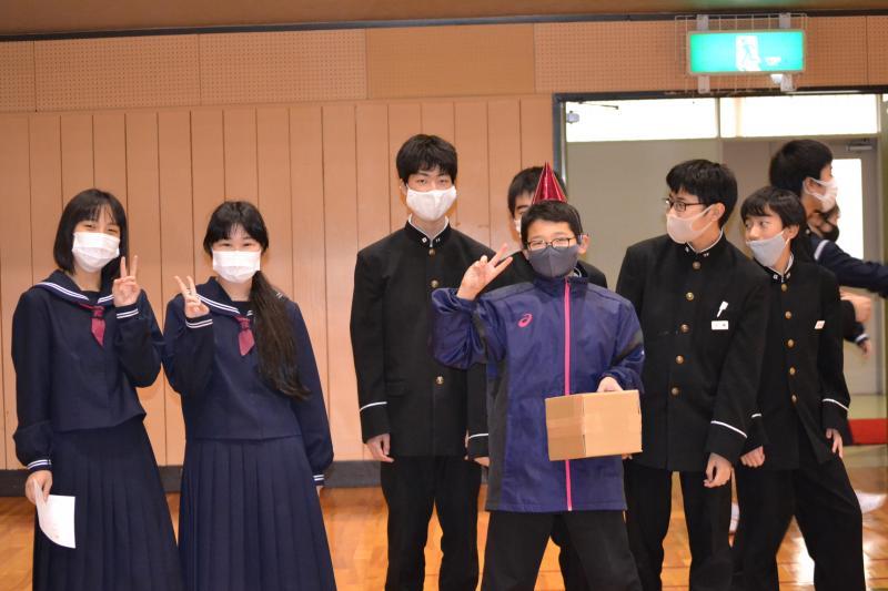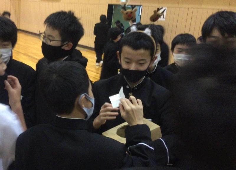 12月25日(金)、1年生室長会主催のお楽しみ会がありました。班ごとに分かれて、室長が持っている箱の中からカードを引き、そこに書かれているタスクを行っていく、というものです。カードには「班員全員で〇〇回以上バレーボールのパスをする」「〇〇先生と写真を撮る」などと書かれており、班ごとに声をかけながら取り組んでいました。1年生全員で大いに盛り上がっていました。